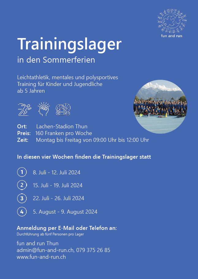 Auch dieses Jahr führen wir in den Sommerferien vier Trainingslager durch: Leichtathletik und polysportives Training im Lachenstadion. Ihr könnt euch auf der Website anmelden. Wir freuen sehr über eure zahlreichen Anmeldungen, insbesondere auch von Ehemaligen. Ihr könnt auch gerne eure Geschwister, Nachbarn, Schulkolleginnen und -kollegen mitbringen - alle Kinder und Jugendlichen ab 5 Jahren sind willkommen.